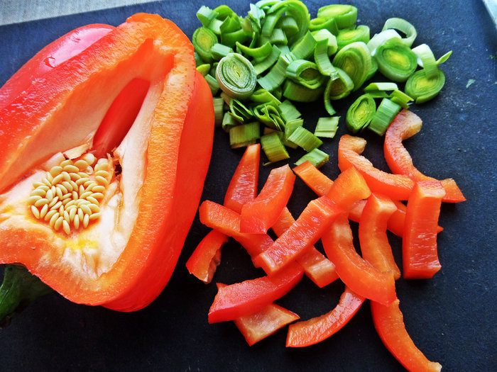 Перец болгарский нарезать соломкой.