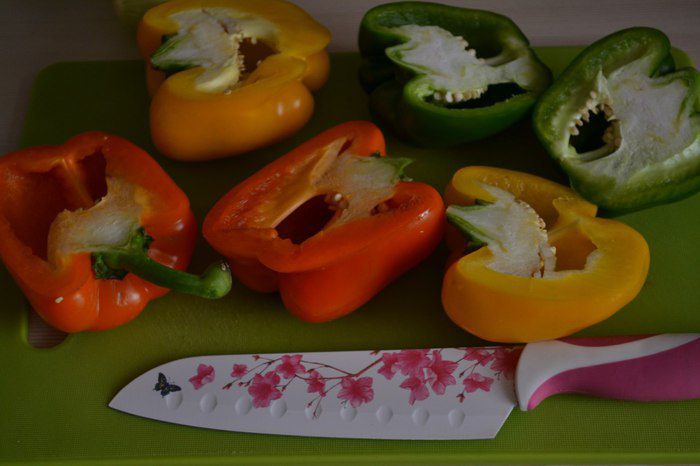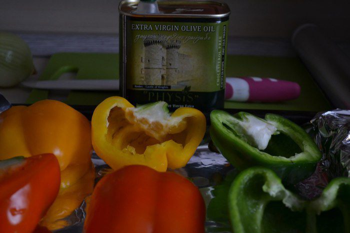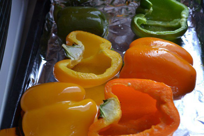 Выложить на фольгу и сбрызнуть маслом (у меня оливковое) и отправить в духовку до полуготовности, а можно и в микроволновку минут на 8, тогда перец не потеряет цвет.