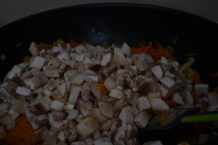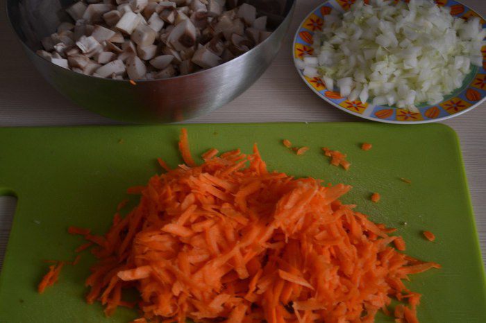 На сковороде обжарить лук, морковь, грибы. Довести до готовности.