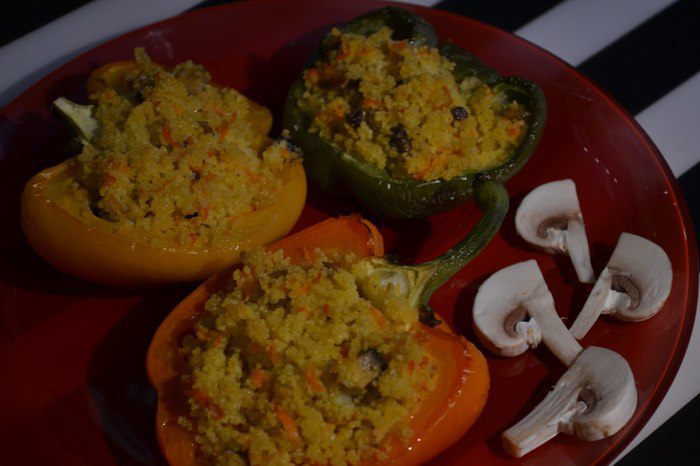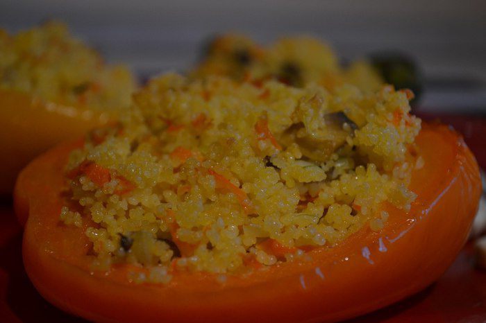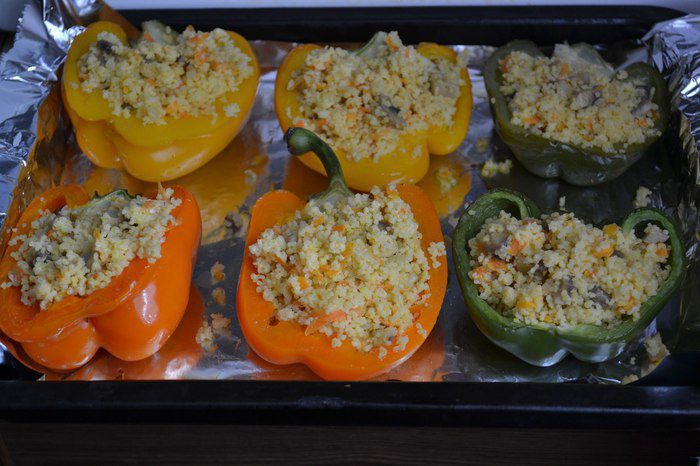 Фаршируем перец кускусом, сбрызгиваем оливковым маслом и в духовку.