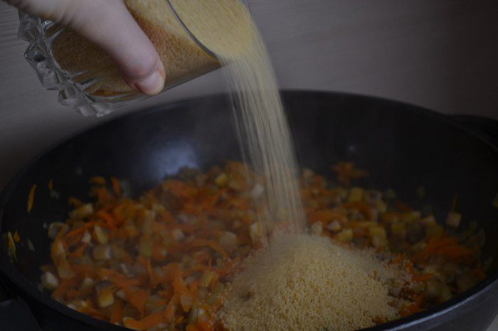 К грибам высыпаем сухой кускус и заливаем водой, накрываем крышкой.