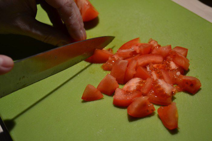 В холодильнике были обычные помидоры - использовала их. Порезать небольшими кусочками.