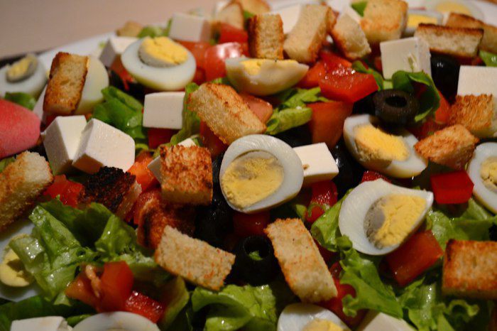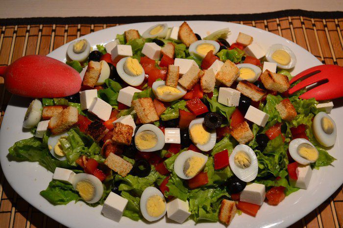 В плоскую миску выкладываем наш салат, добавляем яйца, сыр. Сбрызнуть заправкой, посыпать сухариками.
