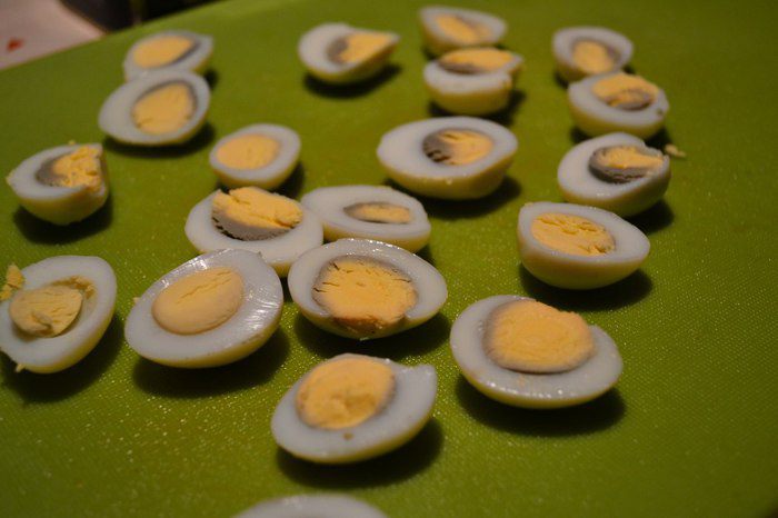 Готовые яйца разрезать пополам.