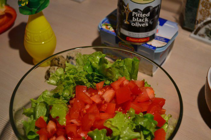 В миске смешиваем салат, помидор, перец.