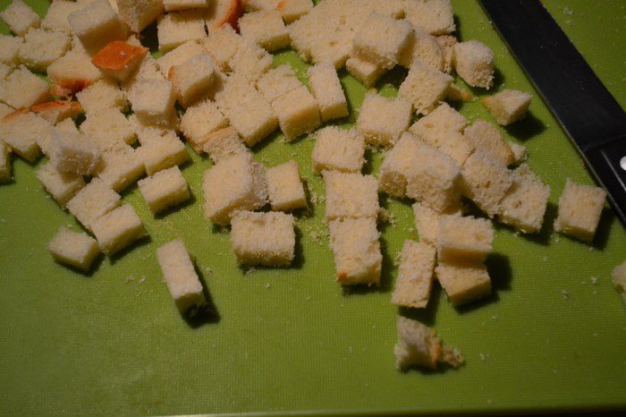 У батона обрезать корочку, мякоть нарезать кубиками. Обжарить на сковороде.