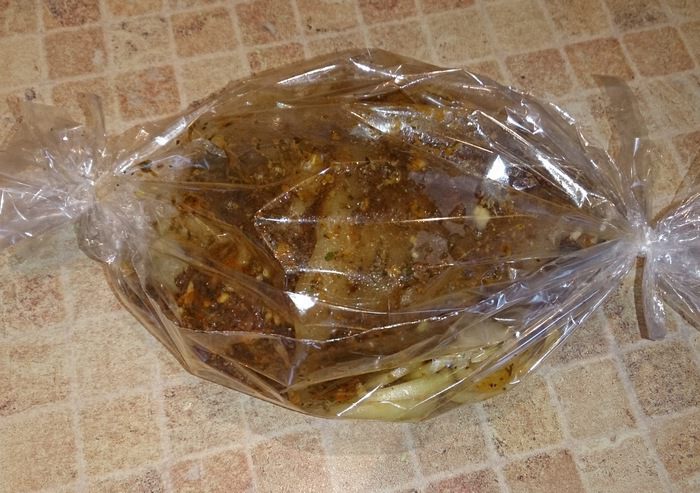Когда рулька отварилась, достаем ее и даем немного остыть. Делаем пару проколов ножом и натираем ее этой смесью тщательно. Засовываем ее в рукав для запекания, немного подливаем бульон 2 ст. л. и ставим в разогретую духовку до 200 градусов на 1 час.