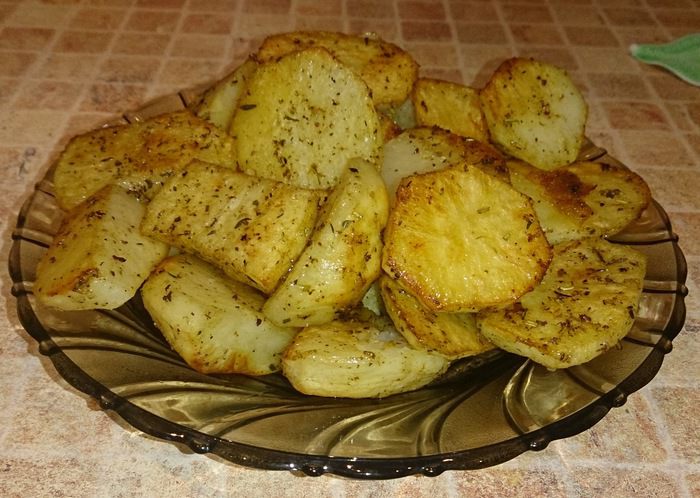 На гарнир можно сделать картофель с итальянскими травами. Чищеный картофель режим на дольки, промываем и кладем в большую миску. К нему добавляем смесь итальянских трав, перец, соль и 2 ст. л. оливкового масла. Перемешиваем руками и выкладываем на сковороду. Ставим в духовку на 40 минут.