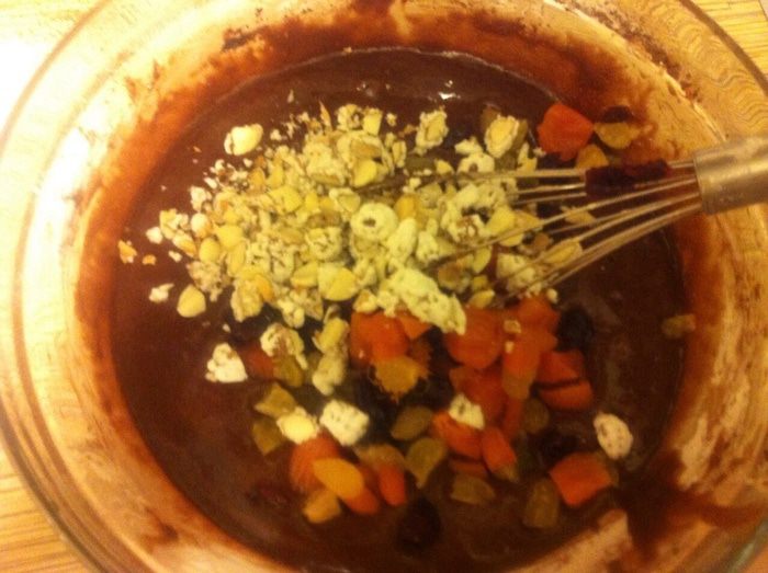 Добавить сухофрукты (у меня: курага, изюм, клюква), рубленный орехи (у меня миндаль), цедру одного лимона и сок 1/2 лимона вымесить венчиком.
