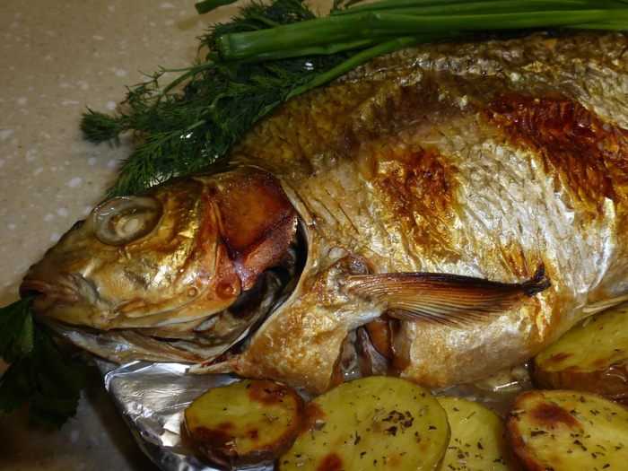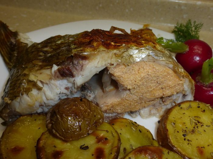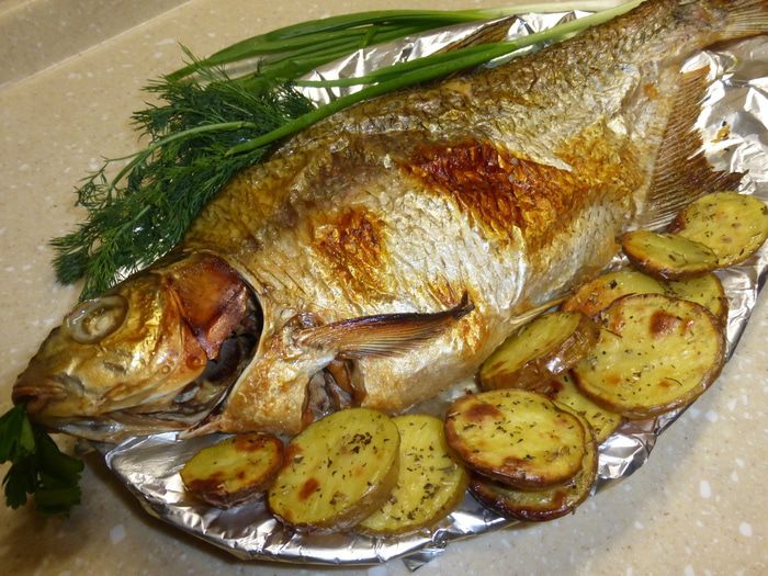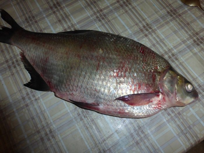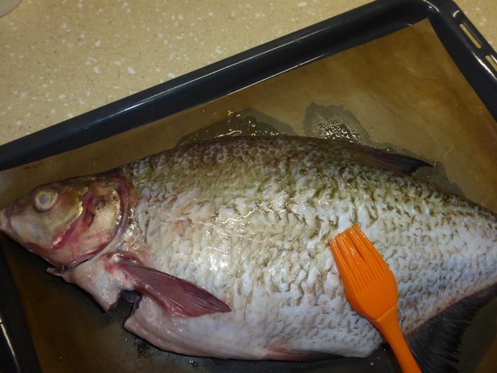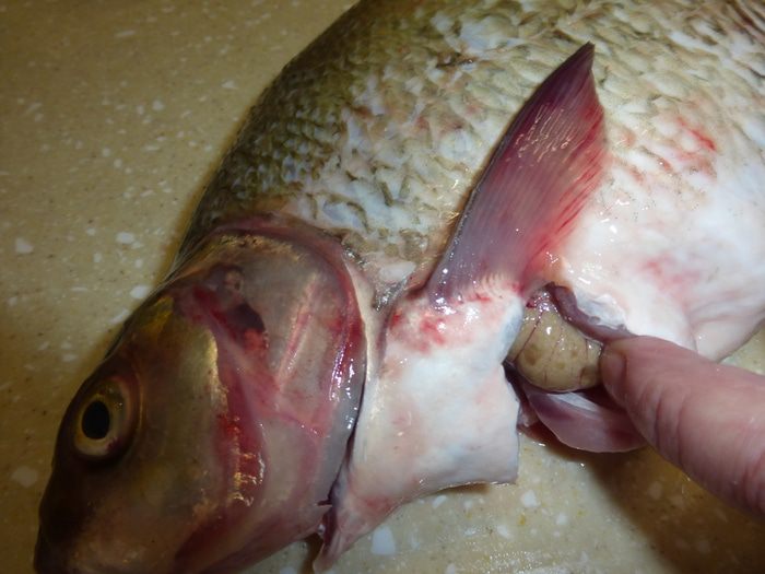 Теперь необходимо удалить у рыбы внутренности, не разрезая леща, чтобы икра, которая находится внутри, не была сухой. Делаем разрез между двумя верхними плавниками и очень аккуратно, стараясь не повредить желчь, извлекаем внутренности. У леща внутри остаются только икра и пузырь. Под проточной водой еще раз моем рыбу сверху и внутри. Натираем леща солью и пытаемся посолить его через верхний разрез