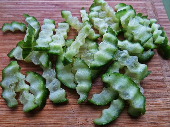 Огурец-брусочками с помощью фигурного ножичка.