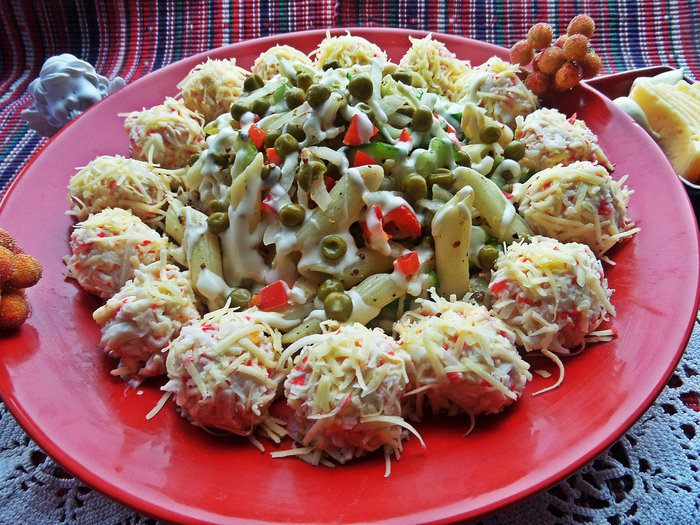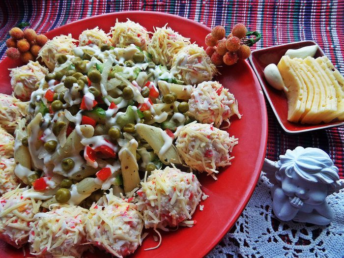 Выкладываем салат горкой, выдавим на него "сеточку" из майонеза, по краю пристраиваем шарики.