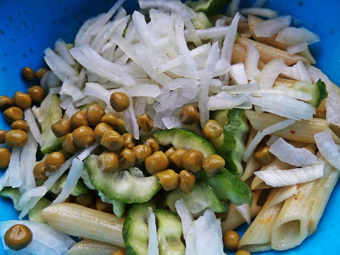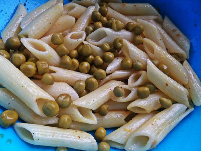 Начинаем смешивать салат. К пенне высыпаем горошек.