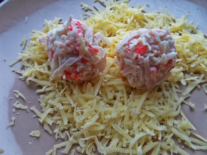 Сыр мелко натереть. Соединить с тёртыми палочками, немного оставить для верха шариков.