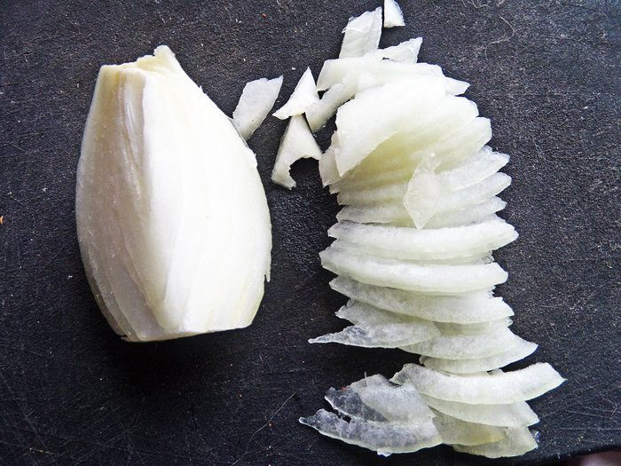 Лук нарезать полупрозрачными слайсами.
