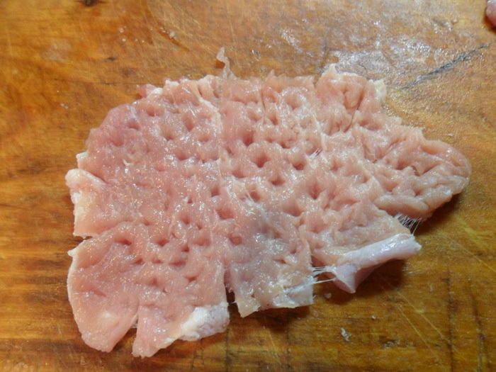 Мясо отбить, края подрезать. Посолить, поперчить.