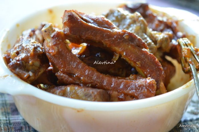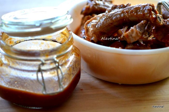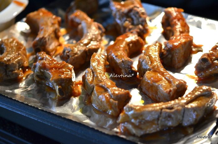 Ребрышки смажем готовым соусом барбекю со всех сторон. Выложим на противень с фольгой и готовим 15 мин режим "бройл" или в духовке при тем-ре 200С. Вновь вернем на стол и смажем второй раз на 15 мин.