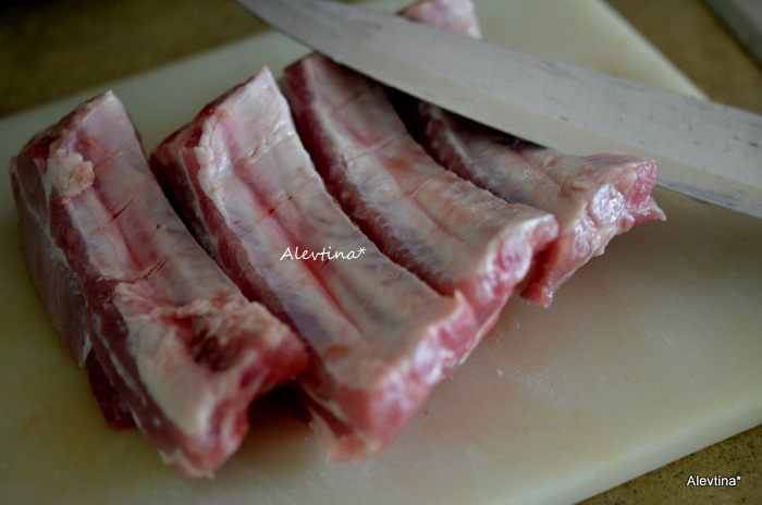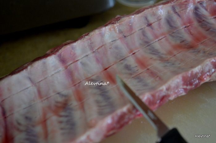Свиные ребрышки куском повернем костями вниз, проведем вдоль острым ножом 2-3 линии как на фото. Это для того, чтобы маринад хорошо впитался.