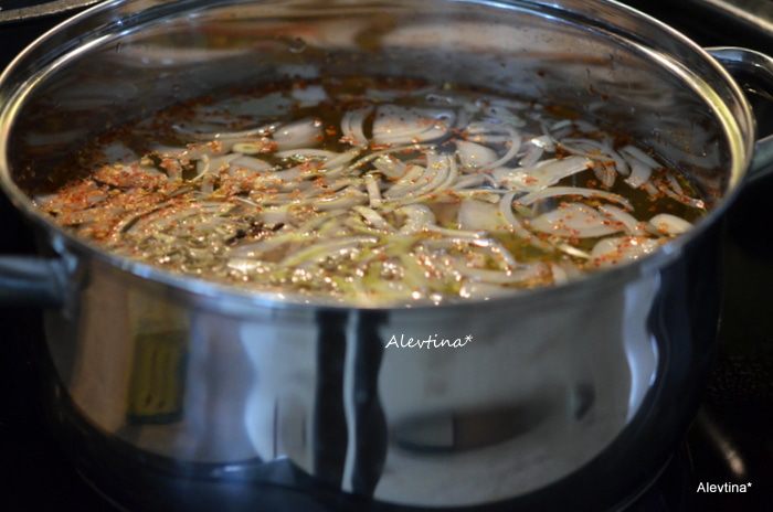 Приготовим в большой кастрюле маринад. Луковицу ½ часть мелко порежем, чеснок раздавим, имбирь 1 см трем на терке, добавим все специи из списка. Доведем до кипения.