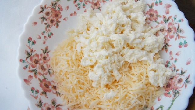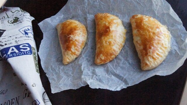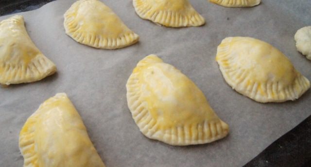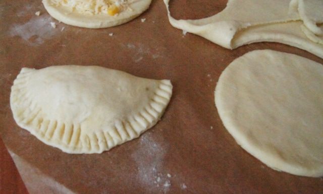 Раскатать тесто толщиной около 2 мм, вырезать круглые лепешки, поместить сырную начинку и немного кукурузы на каждый пирожок. Края смазать водой, чтобы они лучше склеились. Защипнуть пирожок, края придавить вилкой. Приклеить нужно хорошо, чтобы начинка не вытекла.