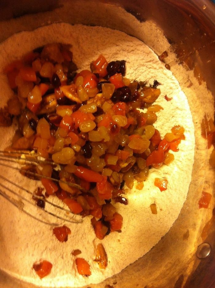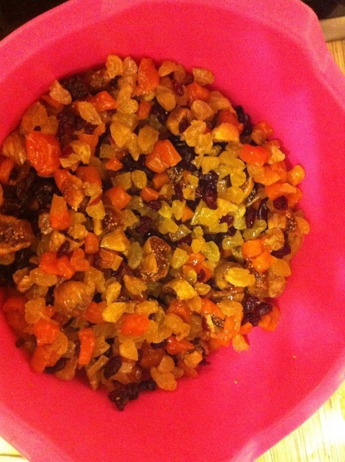 Сухофрукты: курагу, изюм, инжир, клюкву порезать кубиком, мелко порезать засахаренный имбирь, все залить 150 мл рома (коньяк, бренди, апельсиновый ликер) сложить в герметичную посуду, лучше в банку, поставить в темное на неделю, периодически встряхивать.