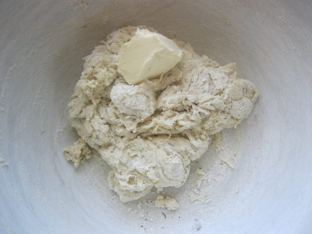 Теперь добавить размягченное масло, и вымесить тесто , пока оно не станет гладким и эластичным.