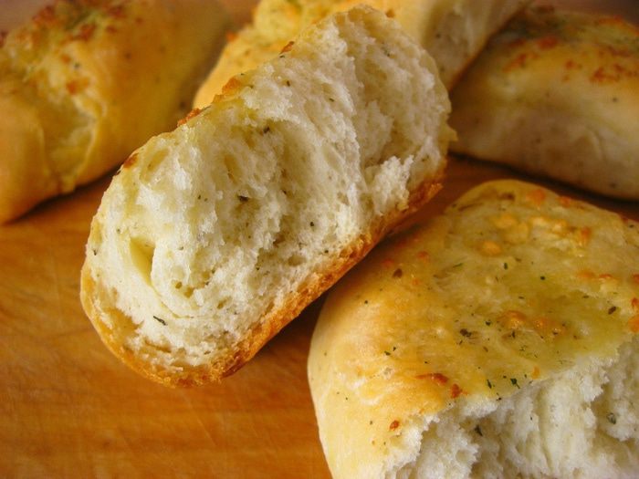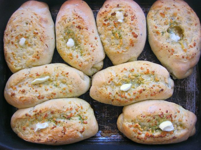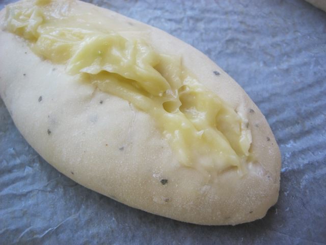 Сделать в булочках продольный разрез и выложить в каждую булочку остывшее чесночное масло.