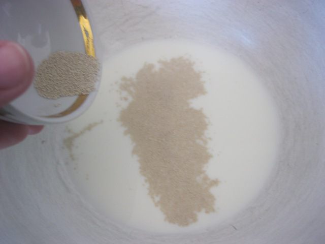 В теплом молоке растворить дрожжи, сахар и соль.