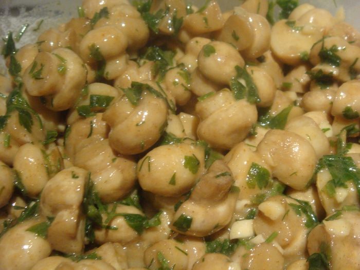 Грибы выложить в глубокую тарелку или кастрюльку, в которой мы их будем заправлять. В горячие грибы добавить порезанный чеснок, зелень.