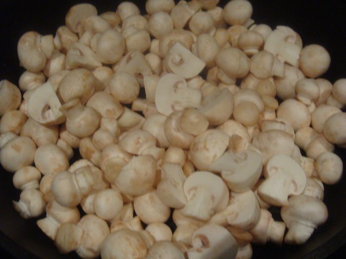 Грибы помыть. Если грибы очень крупные, то разрезать на части и обжарить на сковороде, чтобы выпарилась жидкость.