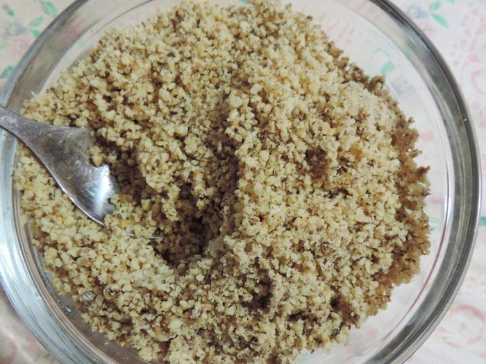 Для начинки измельчить обжаренное ядро грецкого ореха (я смолола его в блендере).