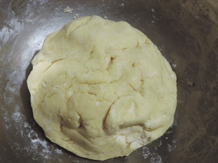 Добавить муку с разрыхлителем и замесить мягкое, липковатое тесто. Пока готовится начинка, убрать его в холодильник.