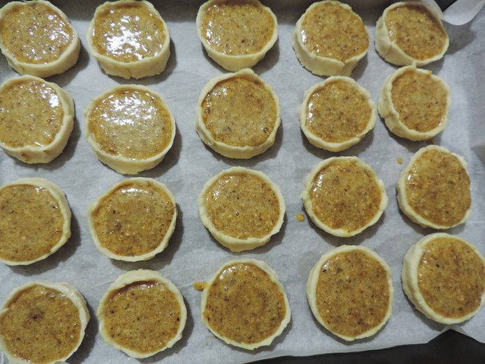 Наполнить углубления начинкой. Не старайтесь заполнить их до краев как на фото, а то начинка может потом вытечь. Оптимальное количество начинки - неполная чайная ложка.