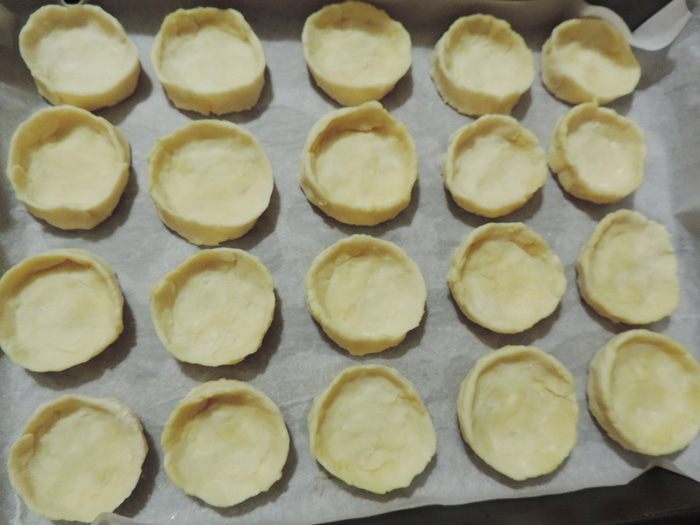 Тесто разделить на шарики размером с грецкий орех. Каждый шарик расплющить пальцами так, чтоб получить «тарелочку» с бортиками. Выложить печенье на противень, застеленный пергаментом.