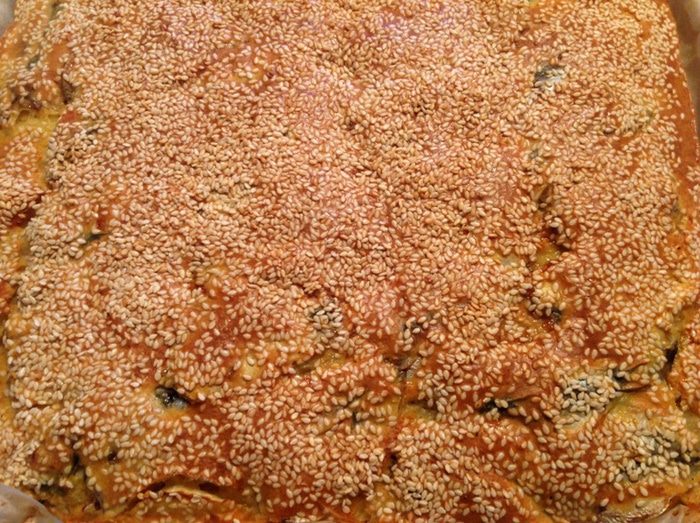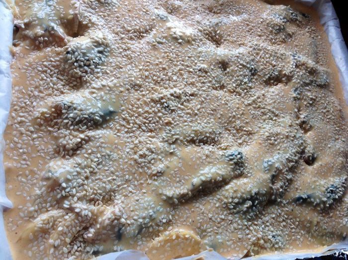 Выливаем на посыпанную бумагу сначала совсем немного теста, так, чтобы получилась тонкая почва для пирога. Сверху выкладываем тюльку как на фото.