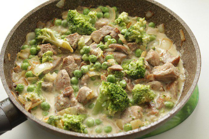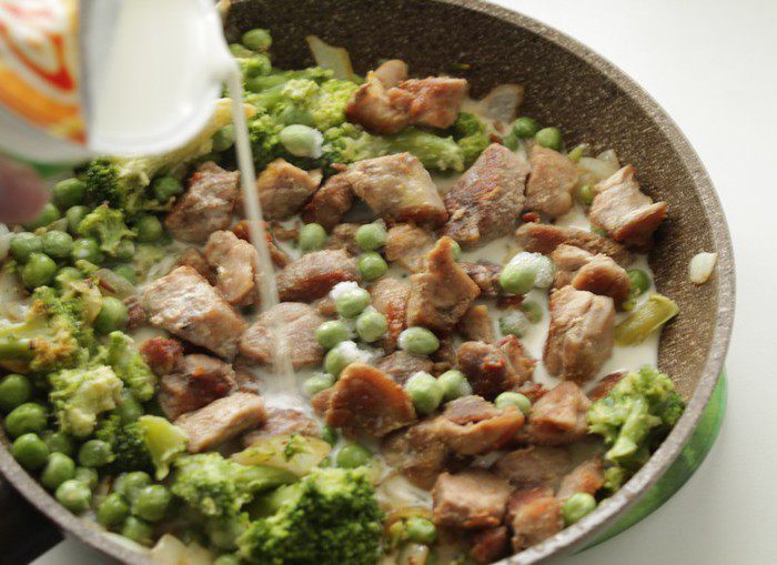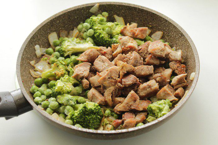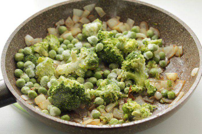 Крупно нарежьте большую луковицу и обжарьте, добавьте горошек и брокколи, потушите несколько минут.