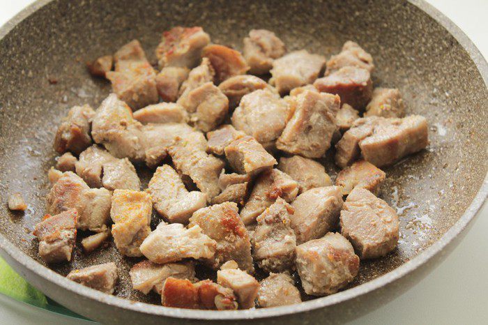 Филе индейки порежьте кусочками и обжарьте до золотистой корочки на оливковом масле. Затем отложите в отдельную тарелку.