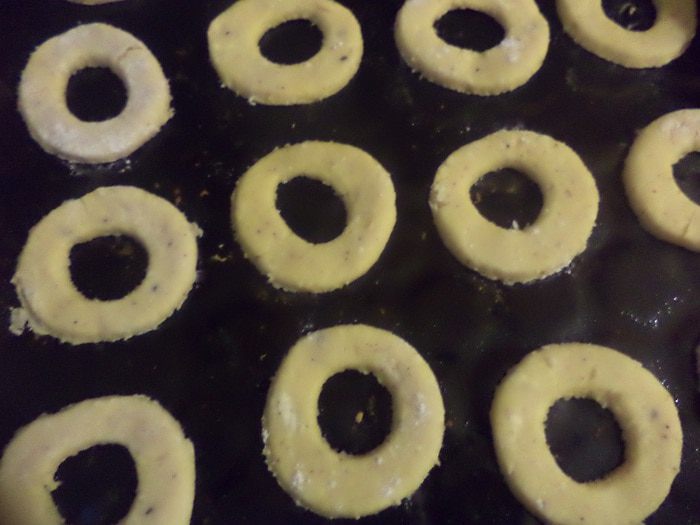 Из оставшегося теста тоже вырезать кружки, но при этом, посередине каждого кружка вырезать дырочку диаметром 1 см. Эти кружки выпекаются немного быстрее.