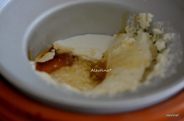 Смешать вручную или на низкой скорости рикотту, мед натуральный жидкий, сливки жирные ¼ стакана, ванильный экстракт, щепотку молотой корицы.