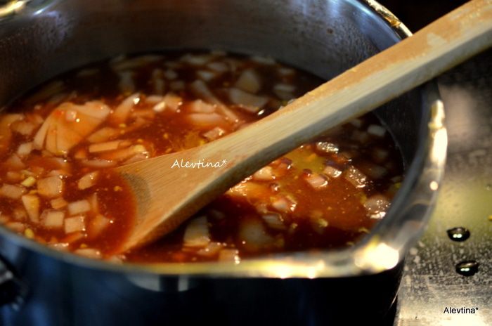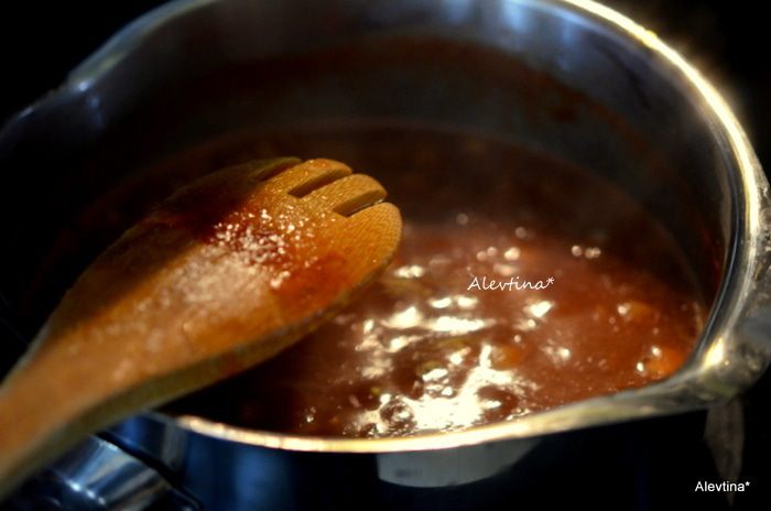 Довести до кипения, огонь убавить и помешивая тушить 30-40 мин. Как только соус станет густым и блестящим снять с огня.