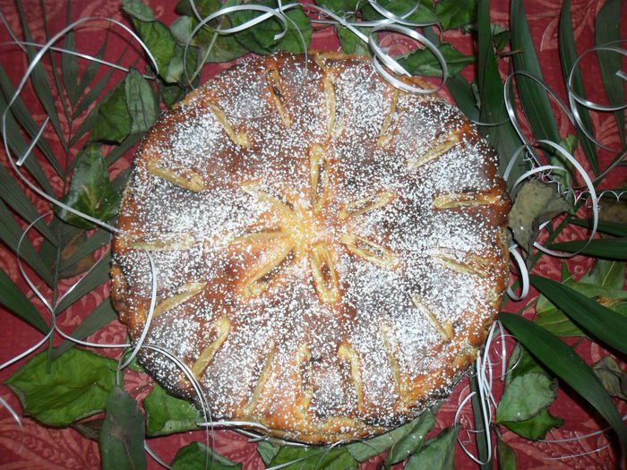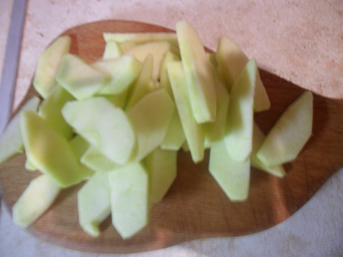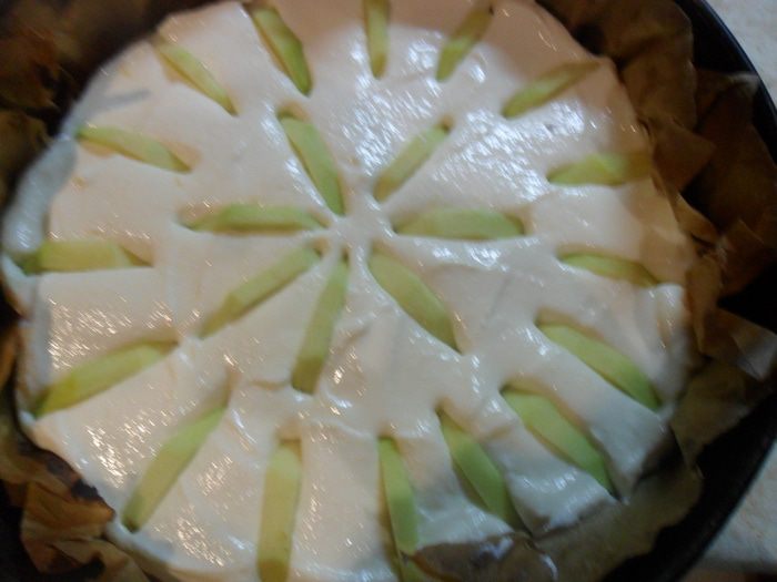 Выложить начинку на корж и вдавливаем яблоки торцом, хотя это не важно как выложить яблоки.