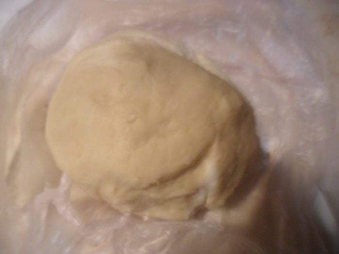 Добавляем сметану, сюда же выдавливаем большую дольку лимона (2-3 ст. л. сока). Добавляем муку смешанную с разрыхлителем, соль. Все! Муки может уйти чуть больше, тесто должно быть мягким, но не липнуть к рукам. Отправляем в холодильник на час.