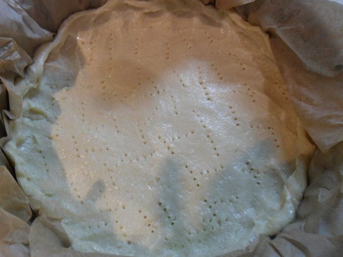 Через час в форму застеленную пергаментом выкладываем тесто, делаем бортики, накалываем вилкой и отправляем в разогретую до 200 С духовку. Духовка должна быть хорошо разогрета, чтоб тесто не стекло.