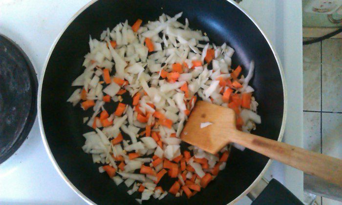 Нагреть сковороду, обжарить сначала чеснок до вкусного запаха, затем добавить капусту и морковь. Добавить воды или масла в сковороду, пропаривать пока морковь не смягчится.