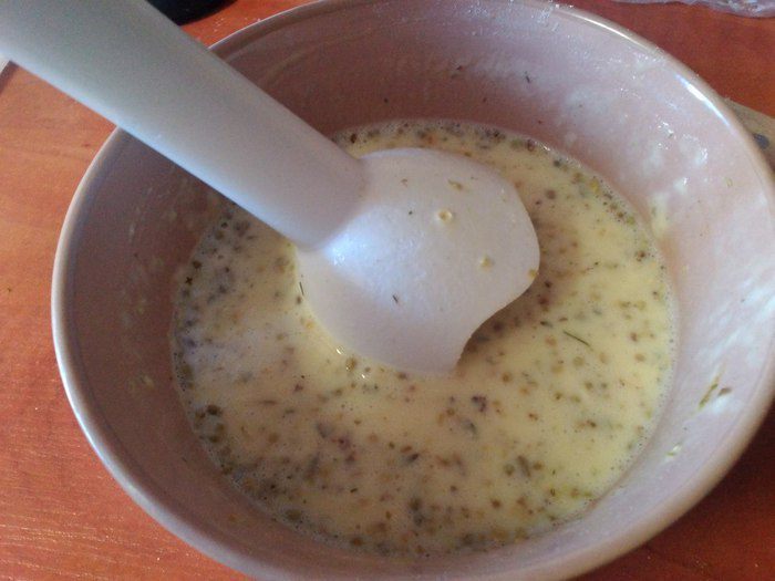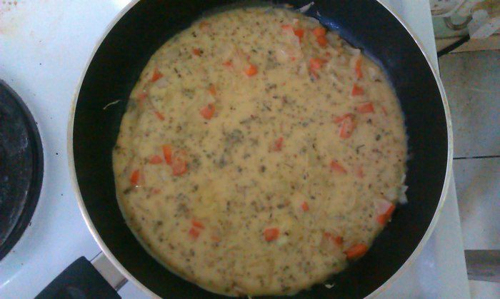 Влить яичную смесь. Накрыть сковороду крышкой и жарить на медленном огне.