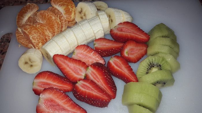 Мандарин чистим и разделяем на дольки, клубнику разрезаем вдоль пополам, банан очищаем и нарезаем кружочками толщиной примерно 1 см, киви чистим и нарезаем дольками.