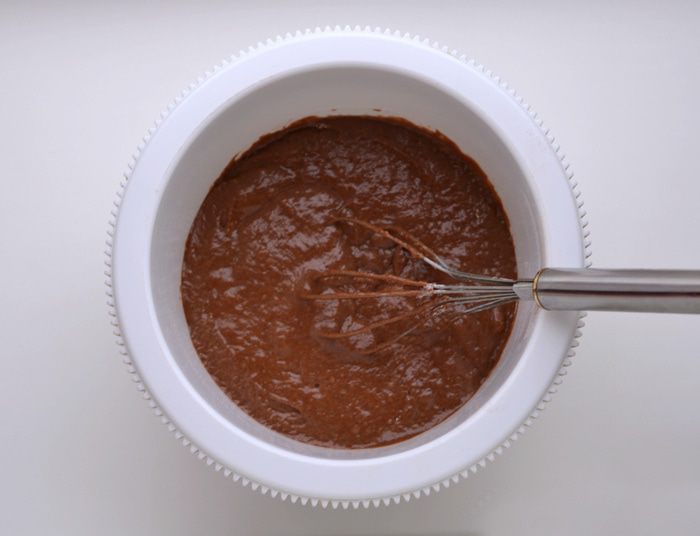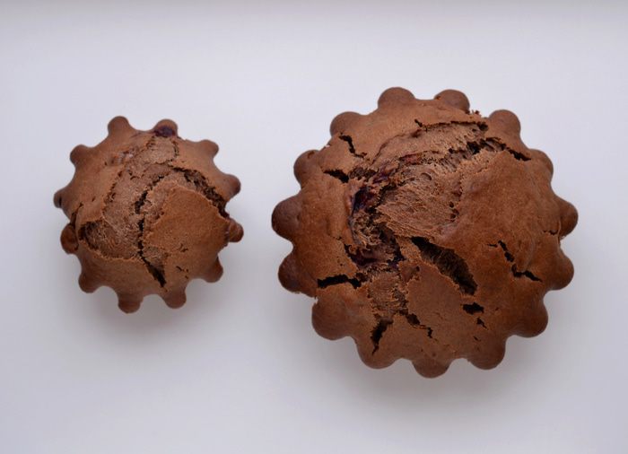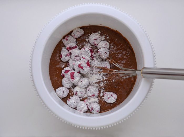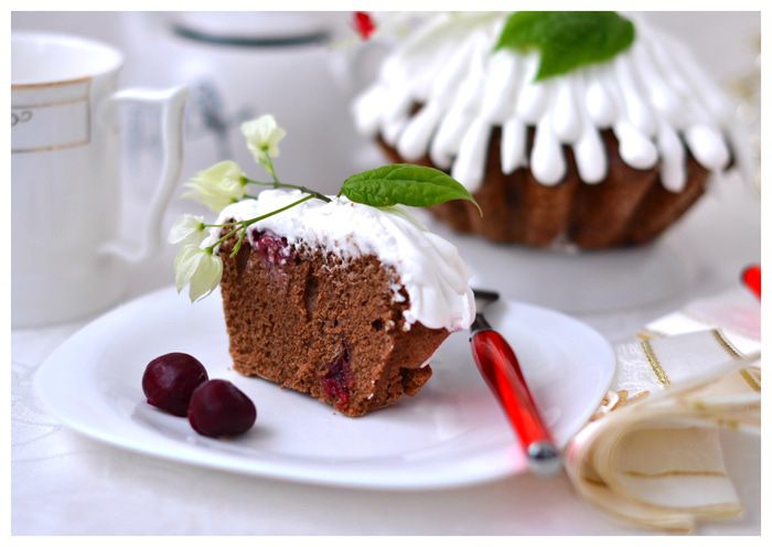 Вишню разморозить, слить жидкость. Присыпать сахаром (30г), добавить коньяк и дать настояться минимум час. Жидкость слить. Вишню обвалять в муке. Форму для кекса смазать растительным или сливочным маслом, присыпать мукой, вылить в нее шоколадное тесто.