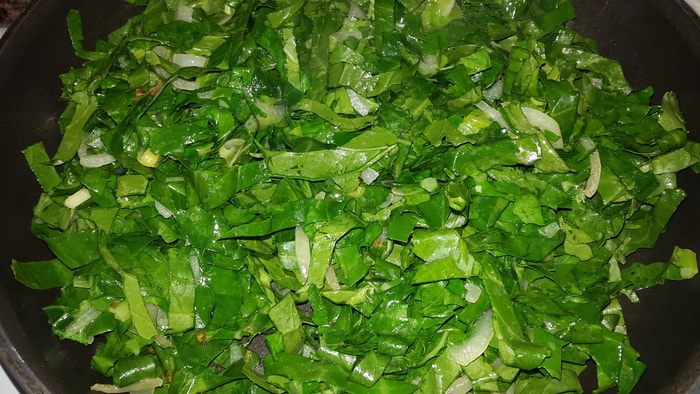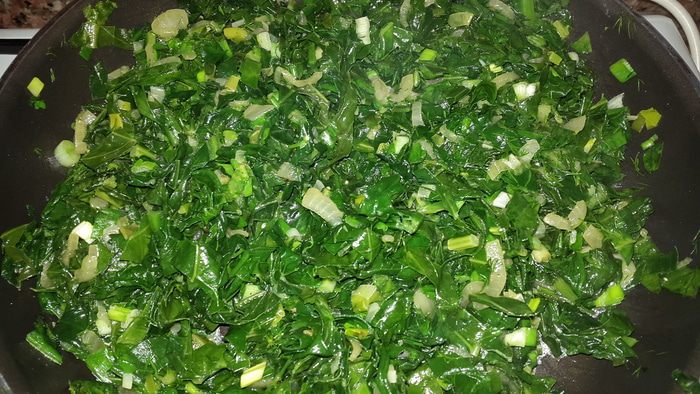 Когда капуста со шпинатом станут мягкими, добавляем зелень, солим, перчим, перемешиваем и выключаем огонь, даем остыть.
