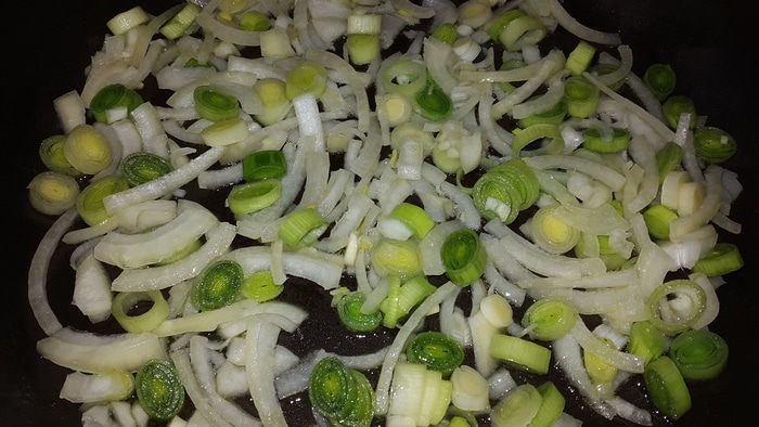 На оливковом масле обжариваем репчатый лук и лук-порей до мягкости.