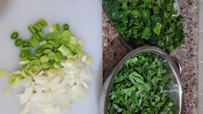 Шпинат и капусту перебираем, моем и режем соломкой шириной 1-1,5 см